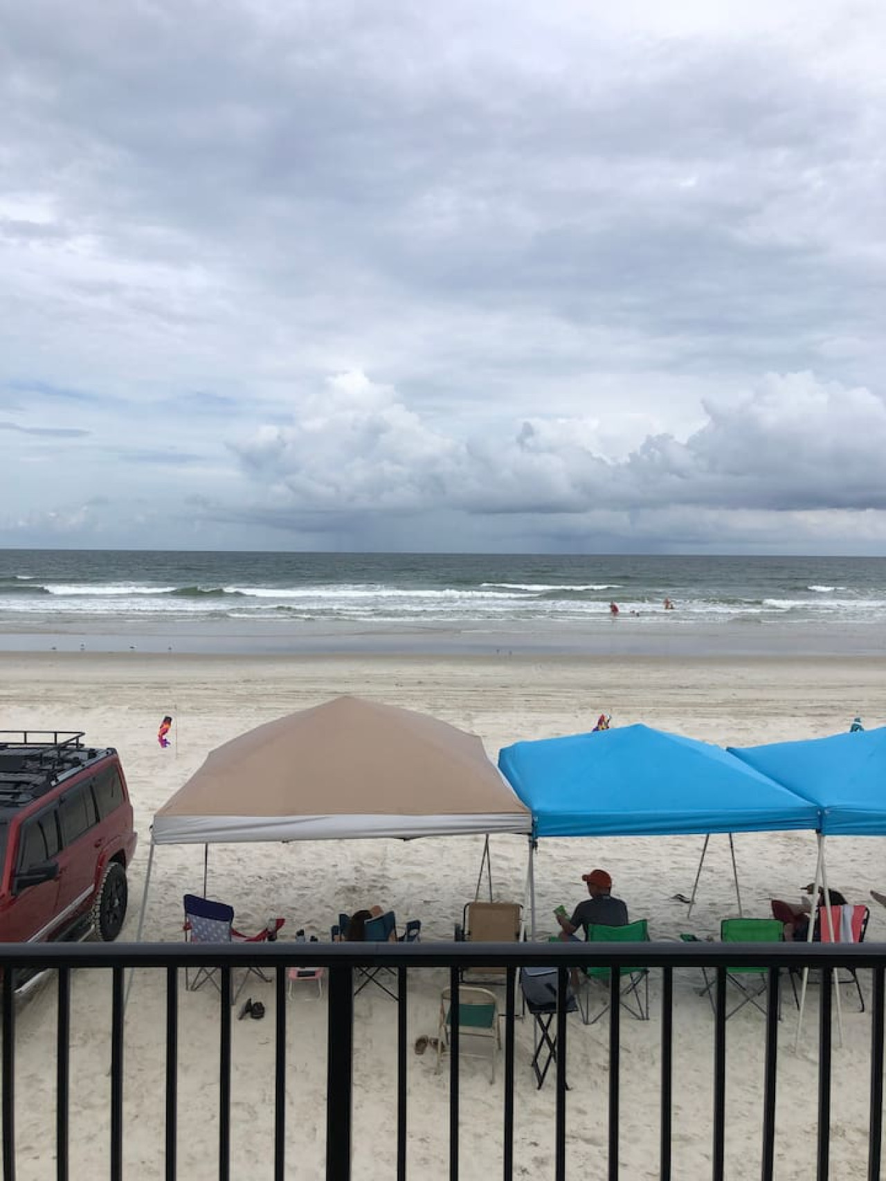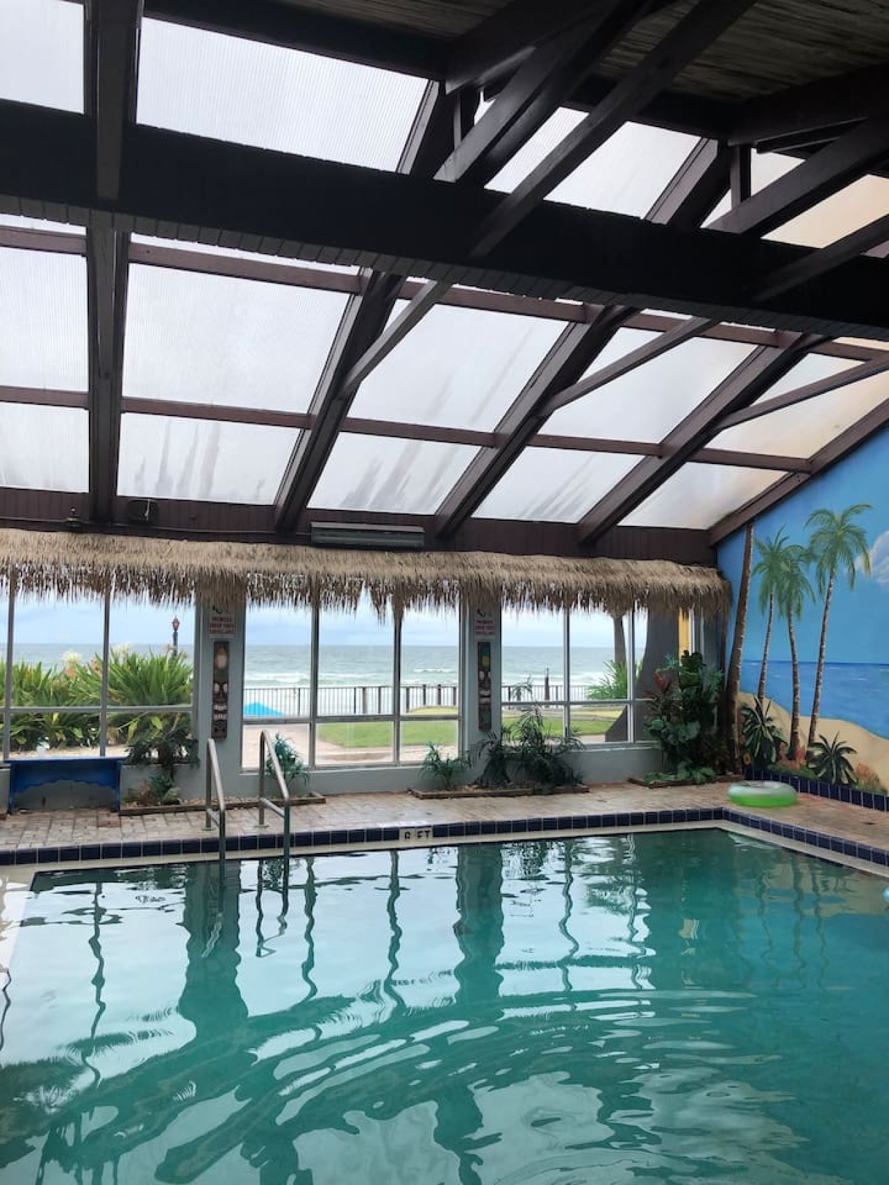 / nightRelax at this peaceful place to stay directly on Daytona Beach Shores with a beautiful newly renovated pool deck, pool, tiki bar and new sea wall. This spacious studio condo has an adjustable queen bed, dining set, full dresser, TV, Wi-Fi, fully stocked mini kitchen, newly tiled tub/shower, workspace desk with printer, beach chairs and much more. Enjoy a cup of coffee on the pool deck while watching the sunrise and sunsets while the ocean roars. Close to everything! This spacious studio condo will make you feel like you’re at home with everything you need. Mini kitchen includes everything for extended stays plus a nice dining area with seating for 4. The adjustable queen bed is sure to give you a good nights sleep. Enjoy great water pressure in newly tiled tub/shower. Tiki bar offers great food and drinks to relax and enjoy Olympic pool or heated pool. Also has desk with printer for work while traveling. Please text me if you need anything during your stay for fastest response.
