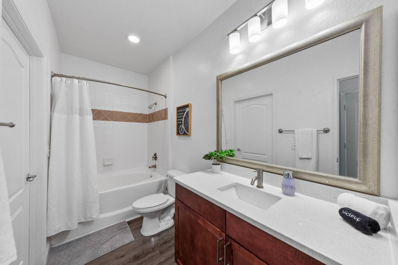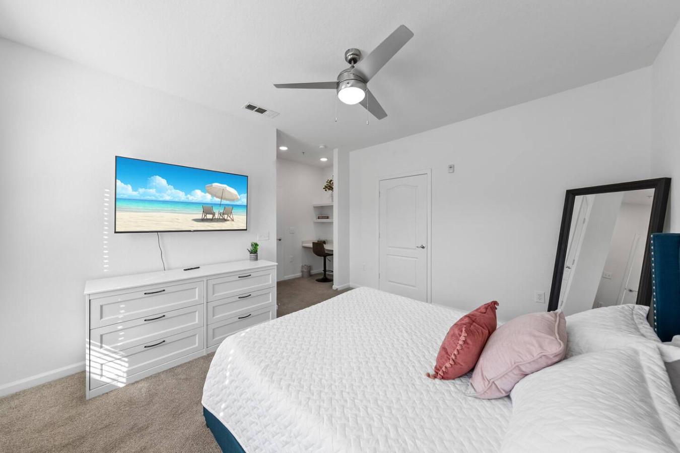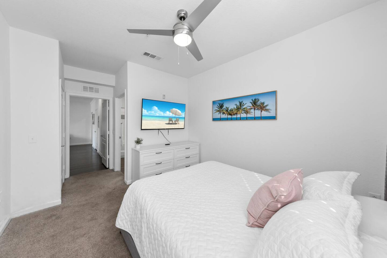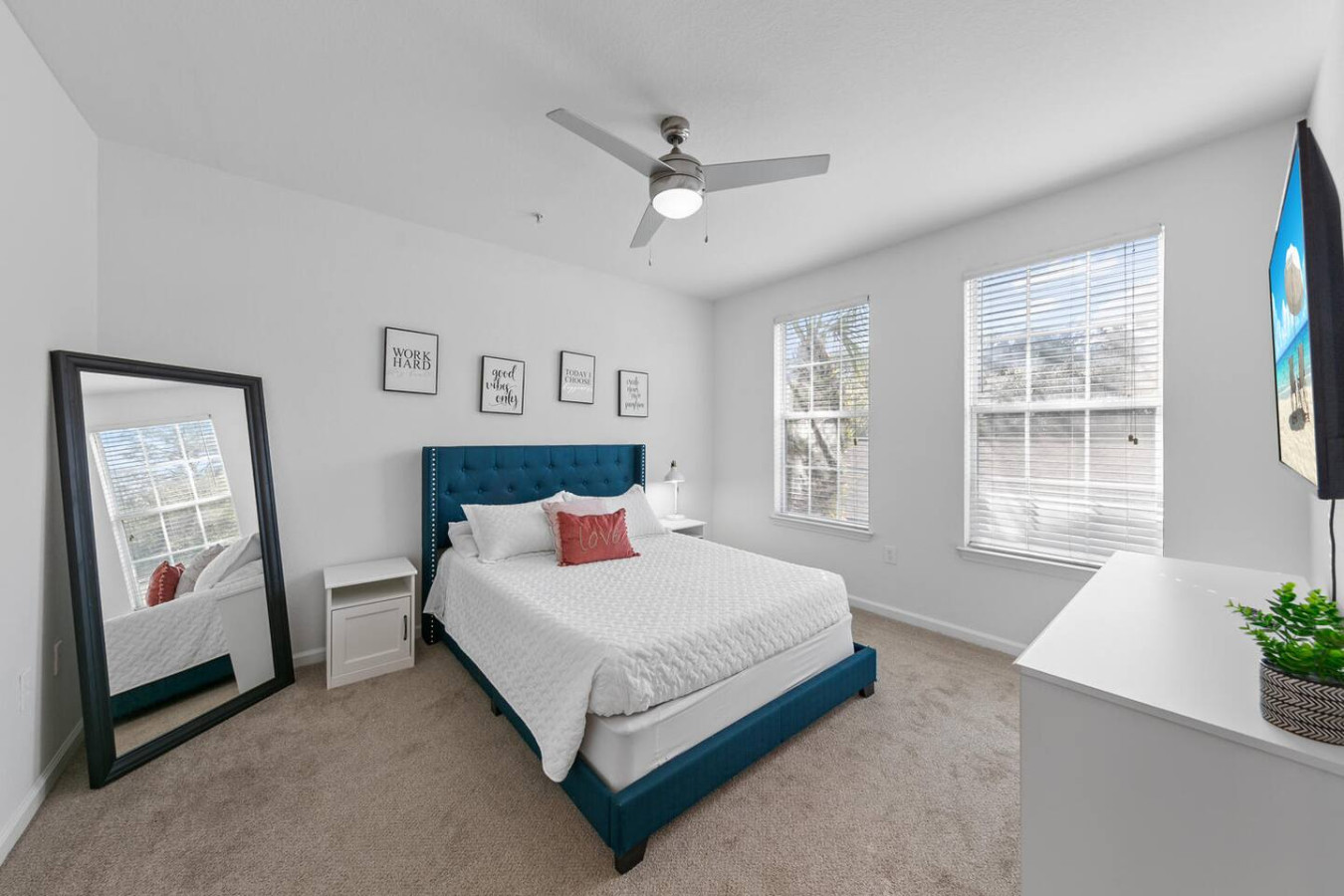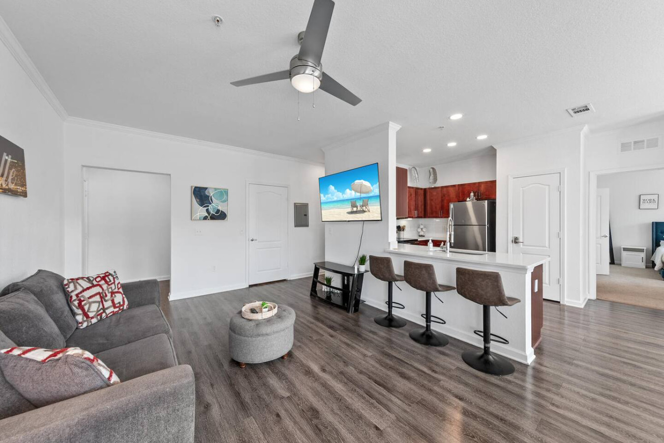 / nightGet ready for an unforgettable stay at this beautifully designed 2-bedroom haven! Perfect for vacations or staycations, this apartment offers the ultimate blend of relaxation and luxury. Enjoy resort-style amenities, including a pool, hot tub, sand volleyball court, a fully equipped fitness center, and more. Thoughtfully furnished with all the comforts of home, this space is designed to provide a seamless and stress-free experience from the moment you arrive. KEY FEATURES: ➝ Resort-style apartment w/spacious floor plan ➝ 2 comfortable bedrooms; 2 Queen Beds ➝ 2 bathrooms; Both with soaking tub/shower combo ➝ Smart TV in every room ➝ Full Kitchen w/stainless steel appliances ➝ High-speed wifi ➝ Washer and dryer ➝ Free parking ➝ Balcony ☆☆AMENITIES☆☆ ➝ Swimming Pool with Sun Loungers ➝ Volleyball Courts ➝ 24 Hour Fitness Health Club ➝ Arcade Room with Gaming Station ➝ Playground Picnic ➝ Area ➝ Private Office Options and a Conference Room ☆☆BEDROOMS☆☆ The bedrooms are tastefully decorated with timeless furnishings, complete sets of linens and pillows, walk-in closet, and Smart TVs. ➝ Bedroom 1: 1 Queen Bed (Private Bathroom) ➝ Bedroom 2: 1 Queen Bed (Private Bathroom) ☆☆BATHROOM☆☆ The bathrooms are designed with your comfort in mind—perfect for refreshing after a day of Florida adventures. You'll find them stocked with complimentary essentials of shampoo, conditioner, and body wash, so you can travel light and still enjoy all the essentials of a relaxing stay. ☆☆KITCHEN & LIVING ROOM☆☆ Step into a bright and spacious living area thoughtfully styled with modern décor and designed for both comfort and connection. The open-concept layout creates the perfect setting for entertaining—whether you're relaxing on the plush sofa, enjoying a movie night on the 65" smart TV, or preparing light bites in the fully equipped kitchen. The kitchen features sleek stainless steel appliances and a spacious counter bar with seating for four, making it ideal for morning coffee chats or casual meals. For those needing to catch up on work or plan their next Florida adventure, the living area also includes a dedicated workspace with high-speed WiFi—ensuring you stay productive and connected throughout your stay. ☆☆OUTSIDE SPACE☆☆ Enjoy the warm weather without the harsh sun on the balcony with seating! In addition to your private patio, you'll have access to a stunning resort-style pool just steps from the apartment. Featuring a beach-style entry and plenty of comfortable sun loungers, it's the perfect spot to unwind and soak up the Florida sunshine. HOME DISTANCE IN MILES FROM: Parks, the Mayo Clinic, shopping, groceries, and the beach, making it a great location for tourists and business travelers alike! Guests will have access to the entire 2-bedroom apartment unit on the second floor during their stay and all amenities listed for use dependent on the condition as noted by the apartment complex. Send a message if you need anything during your stay! With quick response time, we are here to make your stay seamless and enjoyable! Upon your arrival, we offer essential items like hand soap, dish soap, toilet paper, paper towels, and trash bags to start you off. For longer stays, kindly prepare to replenish these supplies according to your personal requirements. We ask that you take care of the home as if it were your own. We hope to provide a great space for all guests to unwind and relax during their time here!