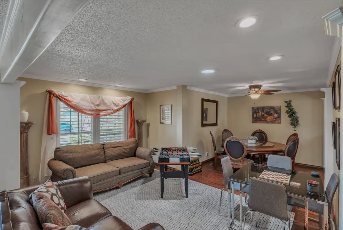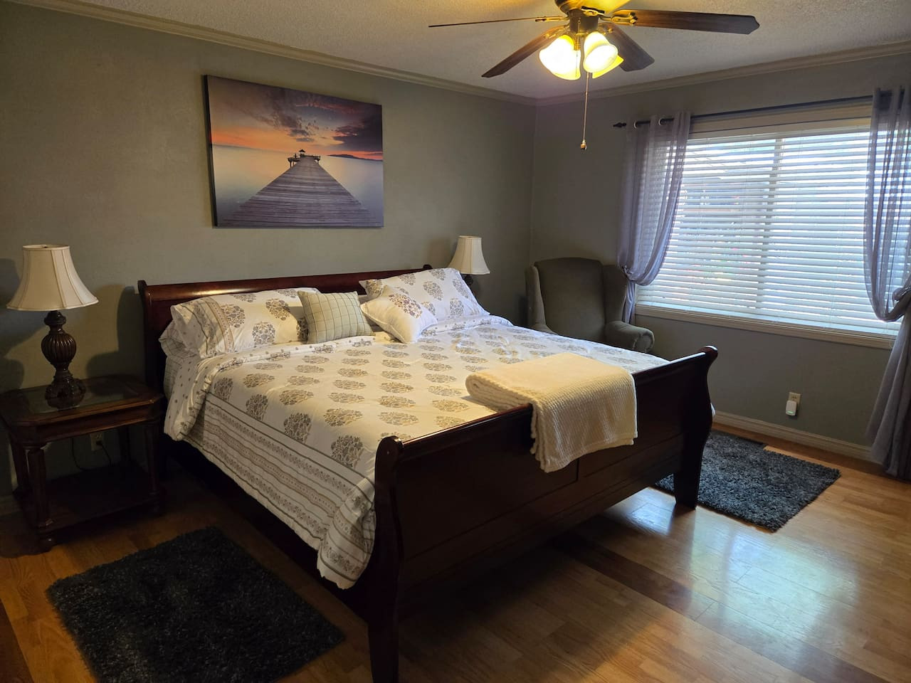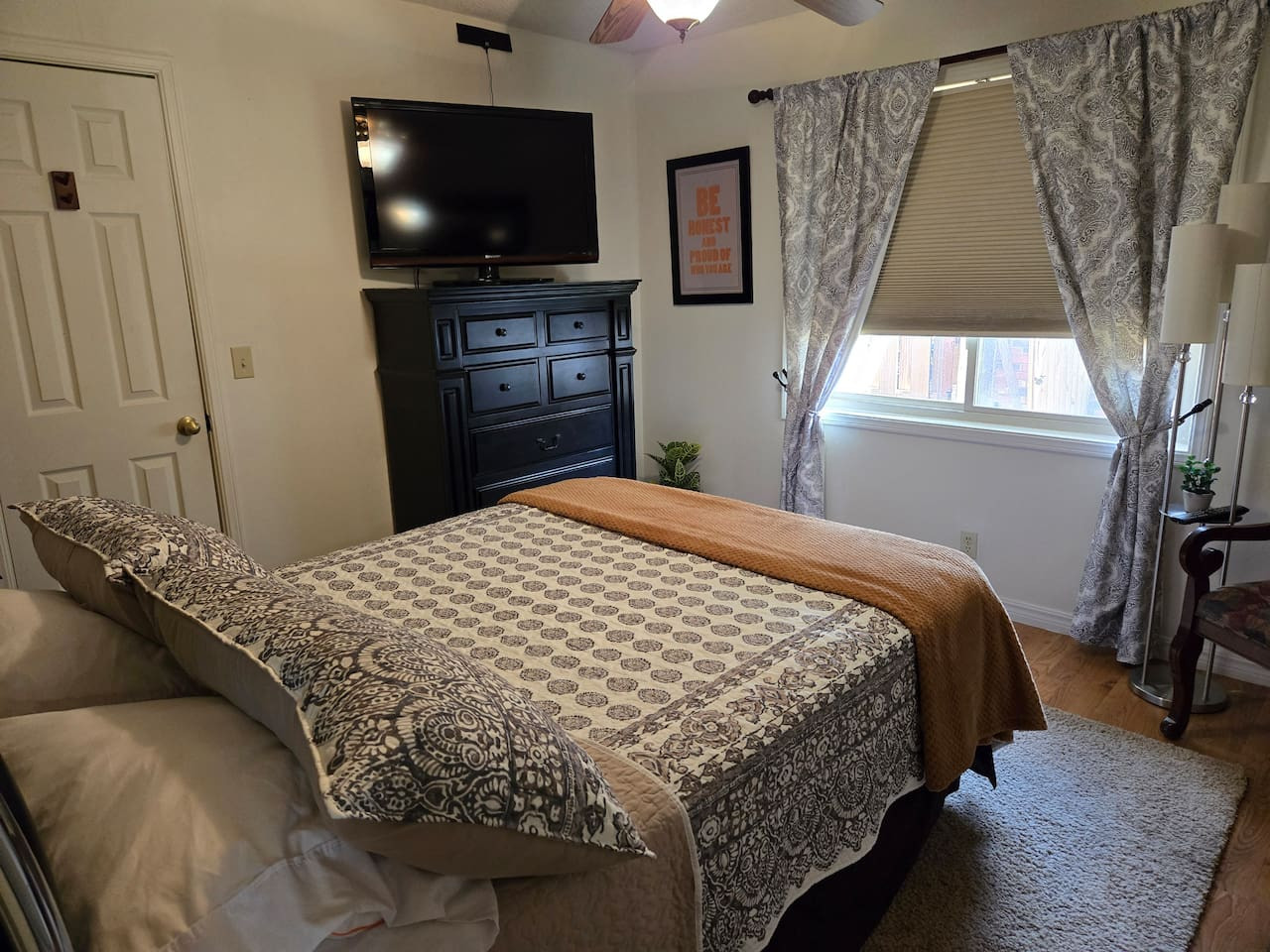 / nightNestled in a quiet neighborhood in SE Tulsa, only minutes from downtown Tulsa! Some known attractions are the world famous BOK center, The Gathering Place, Black Wall Street and many more attractions! This home features 2 living areas, 4 bdrms,2 baths nice patio with grill and plenty of games for the kids including Foosball table! Close to biking trails, neighborhood park and in the summer a neighborhood pool. Close to expressways & shopping. Plenty of cooking utensils! Plenty of parking off street for 4 cars All of the space is available except garage! In the event of an emergency there is a shed apartment out back of property in which a Frenchman, a pastry chef by the name of Hugues he will contact us. Hugues has been a tenant for 3 years. He is trying to recover from some health issues and is a very quiet person. However, he loves to bake. You may observe 3 Feral cats who come to be fed by Hugues at his door, they are afraid of guests and will not interact
