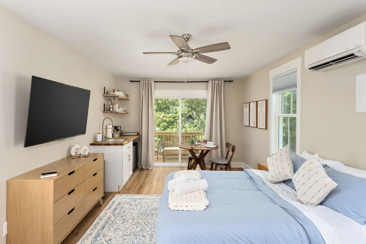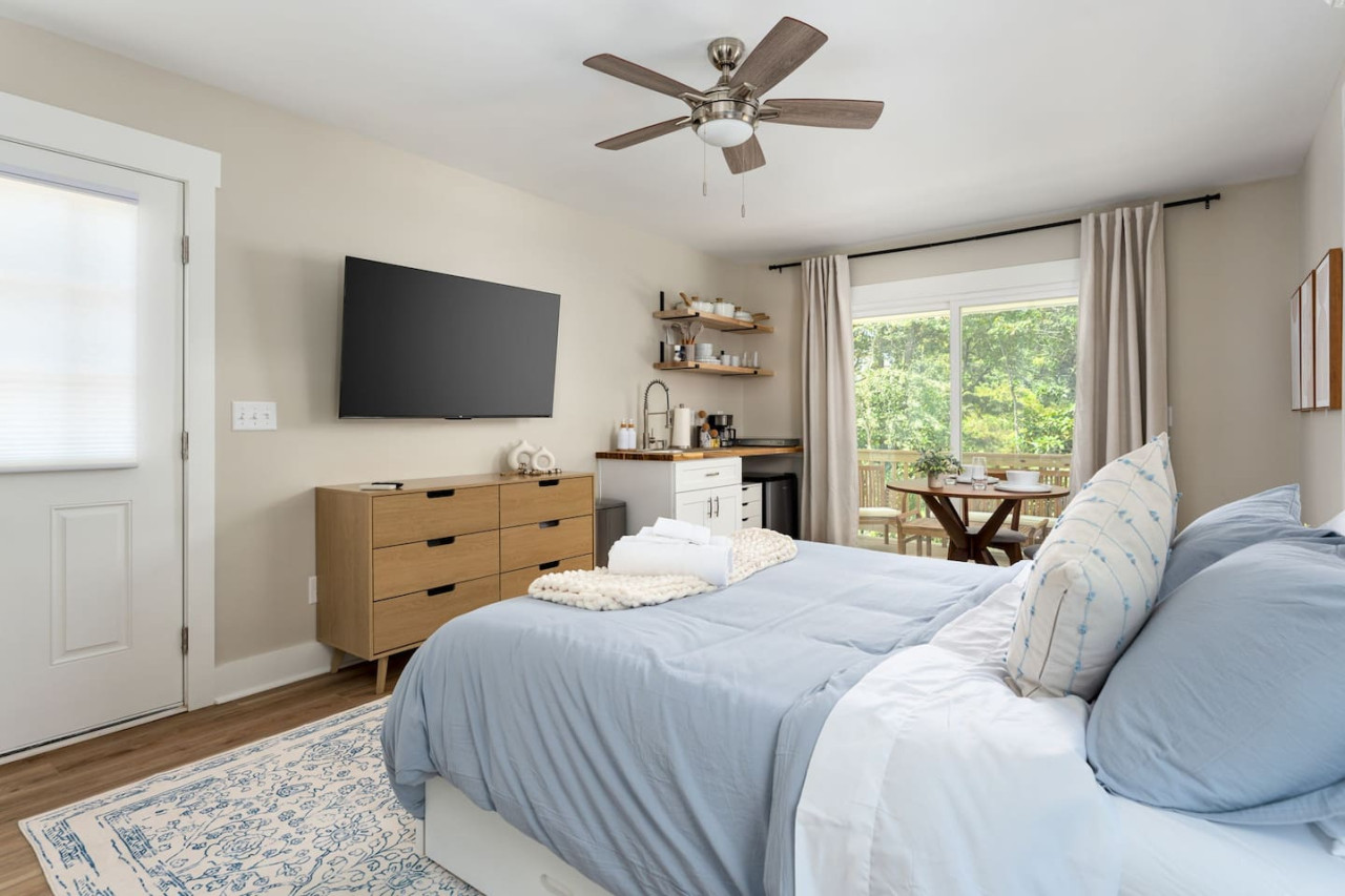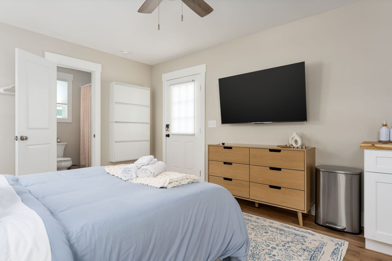 / nightTucked away in central Wilmington, discover serenity in our Nordic-inspired studio, featuring calming wood tones and pale blues. This charming retreat includes a queen bed, a well-equipped kitchenette with a hot plate and mini fridge, and a cozy dining table for two. Enjoy morning coffee or afternoon chats on the private balcony. Located just minutes from the beach, downtown, and local dining and shopping, we're ready to welcome you for the perfect Wilmington visit! KEY FEATURES: ➝ New Construction Home ➝ Comfortable Queen Bed ➝ Full Bathroom with Shower/Bathtub Combo ➝ Kitchenette w/Mini Fridge, Hot Plate, Coffee ➝ High-speed wifi + TV ➝ Washer and Dryer ➝ Free Designated Parking ☆☆BEDROOM☆☆ Experience restful nights in our studio’s cozy queen bed. The bed is dressed in soft, high-quality linens and surrounded by calming wood tones and pale blues. Keep up with your favorite episodes on the 55" TV with streaming services. ➝ 1 Queen Bed (Private Bathroom) ☆☆BATHROOM☆☆ The bathroom features a modern tub/shower combo, perfect for a refreshing soak or quick shower. We provide all essential soaps and a hair dryer for your convenience. Clean, stylish, and well-stocked, this space ensures a comfortable and effortless experience during your stay. ☆☆KITCHEN & DINING☆☆ Our studio’s kitchenette is thoughtfully equipped for your culinary needs. It includes a drip coffee maker and tea for your morning routine, a hot plate for cooking, and essential pots and pans. You'll also find plates, cups, bowls, and utensils for easy meal preparation. The mini fridge ensures you have plenty of storage for your groceries and snacks. Whether you're brewing a fresh cup of coffee or preparing a simple meal to enjoy at the dining table, this kitchenette has you covered. ☆☆OUTSIDE SPACE☆☆ You will have access to the private balcony and seating throughout your stay. This home is truly one-of-a-kind when it comes to location! You will be tucked at the end of a road with no through traffic, adding an amazing peaceful feel to your stay. You will also be provided designated parking space. This studio is situated at the back of a larger home. While the studio space is not shared and each home has it's own private entrance, the parking area will be shared and it is possible you will pass by the friendly, long-term renters in the front home. HOME DISTANCE IN MILES FROM: This stunning home is ideally located close to the beach, downtown, shopping, dining, and the hospital, making it a great location for tourists and business travelers alike. ➝ Wilmington International Airport: 9 miles ➝ Downtown Wilmington: 6 miles ➝ Wrightsville Beach: 5 miles ➝ Live Oak Bank Pavilion: 9 miles ➝ Carolina Beach: 14 miles ➝ Long Leaf Park: 1 mile ➝ Mayfaire Town Center: 5 miles Guests will have access to the entire studio home above the garage during their stay along with parking. Send a message if you need anything during your stay! With quick response time and local to the area, we are here to make your stay seamless and enjoyable! The area features tree-lined streets and a welcoming community atmosphere. The home located at a dead end road creates a calm corner of paradise in a centrally located part of Wilmington. You'll find local shops, cafes, and restaurants just a short drive away, making it easy to explore Wilmington's vibrant culinary and cultural scene. Nearby parks and nature trails provide opportunities for outdoor activities, while the beautiful beaches of Wilmington are within a short drive for sun and relaxation. Enjoy the best of both quiet retreat and city accessibility in this lovely corner of Wilmington! We recommend vehicle transportation to explore all that Wilmington and surrounding beaches have to offer! Upon your arrival, we offer essential items like hand soap, dish soap, toilet paper, paper towels, and trash bags to start you off. For longer stays, kindly prepare to replenish these supplies according to your personal requirements. We ask that you take care of the home as if it were your own. We hope to provide a great space for all guests to unwind and relax during their time here!