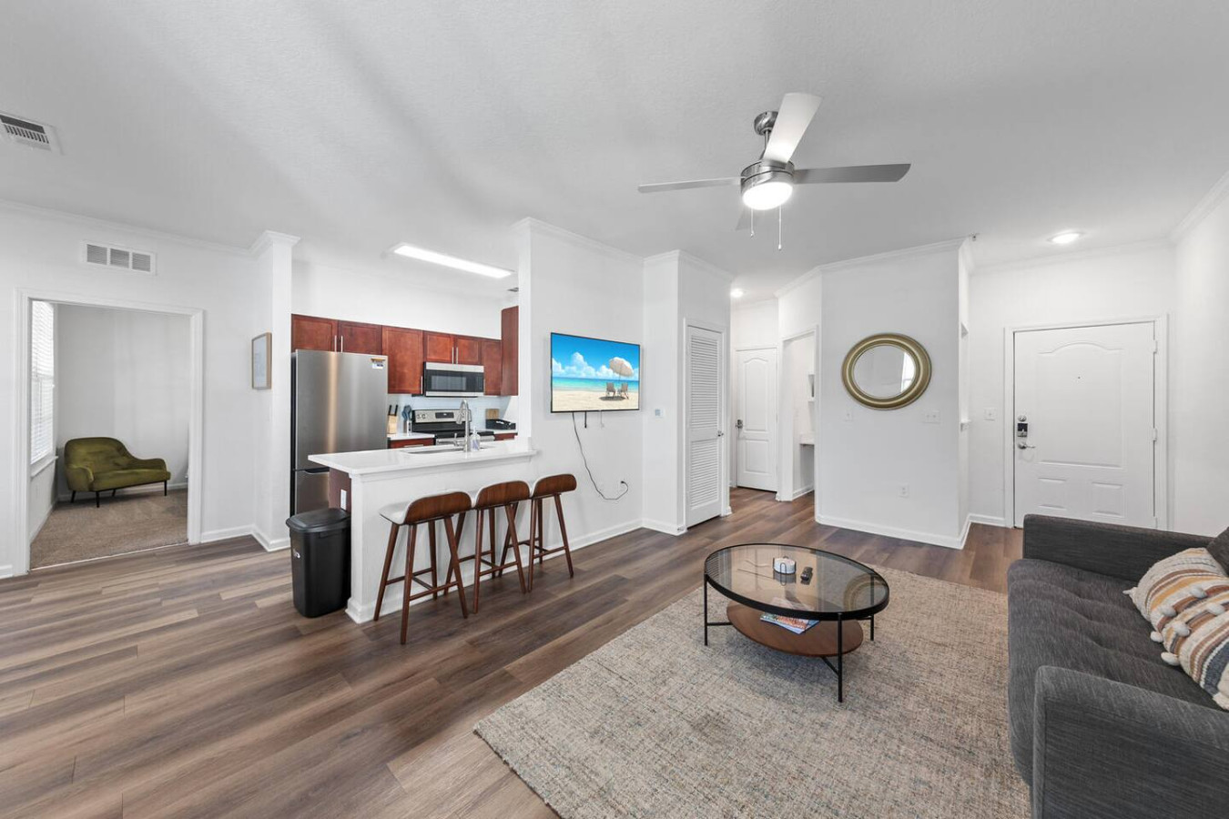 / nightPack your bags and come stay at this lovely, stylish, and clean 1 bedroom! Vacation or staycation, this is the place for you. Relax poolside, watch a movie on the 70in TV or take a quick drive to explore the city. Amenities include a resort style pool, sand volley ball court, gym & more. This unit is equipped with everything you need to be your home away from home. The bedroom is a tranquil sanctuary, featuring a sumptuous bed and ample storage space. The bathroom is a spa-inspired retreat, complete with elegant finishes and a rejuvenating soaking tub. Unwind on your private balcony, where you can sip your morning coffee or enjoy a glass of wine as the sun sets. However, the real allure lies in the resort's lavish amenities. Immerse yourself in the crystal-clear waters of the pool, Hot Tub, all while being surrounded by tropical landscaping that creates an idyllic atmosphere. Work on your fitness goals in the state-of-the-art gym, challenge a friend to a game on the sand volley ball courts, or simply relax in the inviting common areas. Convenience is paramount with high-speed Wi-Fi, on-site parking, and proximity to Jacksonville's attractions. Whether you're here for business or leisure, this space ensures a memorable stay in a prime location. Book now and treat yourself to the luxury and relaxation you deserve at this resort-style gem in Jacksonville, FL. Your perfect escape awaits! Guests will have access to the entire 1-bedroom apartment unit on the first floor during their stay and all amenities listed above for use. Send a message if you need anything during your stay! With quick response time, we are here to make your stay seamless and enjoyable! Upon your arrival, we offer essential items like hand soap, dish soap, toilet paper, paper towels, and trash bags to start you off. For longer stays, kindly prepare to replenish these supplies according to your personal requirements. We ask that you take care of the home as if it were your own. We hope to provide a great space for all guests to unwind and relax during their time here!