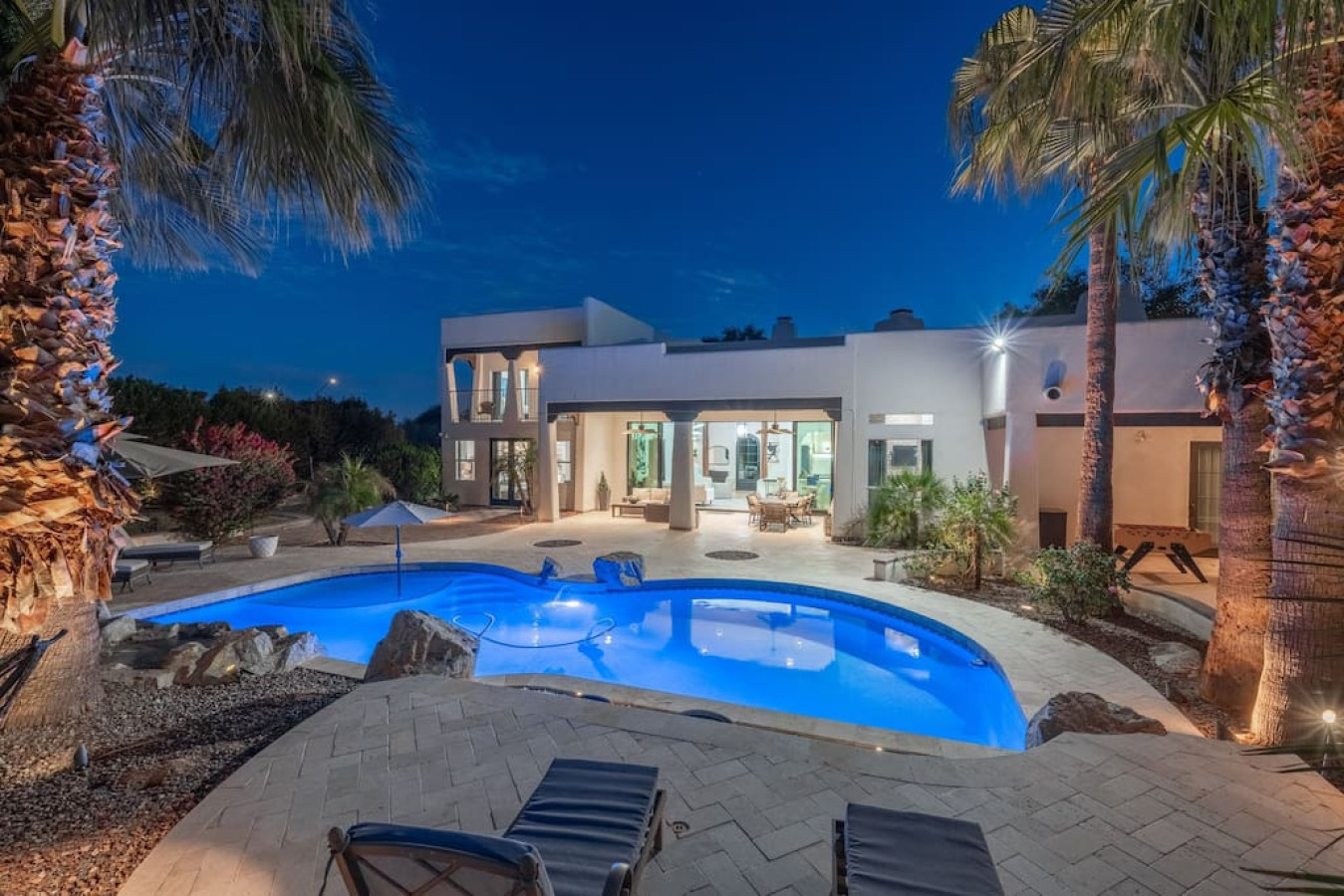 / nightWelcome to our grand oasis in the heart of Scottsdale! This stunning home is more than just a place to stay - it's an experience of upscale comfort and entertainment. With 5 beautifully appointed bedrooms and 4 modern bathrooms, this home is perfect for families, business groups, or friends seeking an unforgettable getaway. -15min to Old Town Scottsdale and Fashion Square Shopping -9min to TPC Stadium Golf Course -10min to Hiking Trails -10min to Airport -5min to HonorHealth Medical Center Upon entering the home through the Spanish-style courtyard, you are met with a STUNNING view of the home, the expansive backyard, and its mountainous surroundings. The 4,300+ sq ft of living space with a split floor plan sitting on an acre lot has been beautifully remodeled with high-end living experience in mind. You won’t ever want to leave! SPLIT FLOOR PLAN: Downstairs you will find 3 Queen bedrooms, one which utilizes a full hallway bathroom, and the others that share a Jack and Jill bathroom. On the opposite side of the home you will find the large Primary Suite with a King size bed, electric fireplace, and attached bathroom with large walk-in closet, Jacuzzi tub, and walk-in shower with his and hers shower heads AND rain shower. Upstairs you will find a "mother-in-law suite." This portion of the home is equipped with 2 Queen beds, a full bathroom, kitchenette with mini-fridge and sink, along with seating area and TV. Not to mention, your balcony overlooking the beautiful backyard and pool! GOURMET KITCHEN: The kitchen is fully stocked for your next home-cooked meal and outfitted with Viking and Thermador high-end appliances. Not to mention the Miele Built-In Coffee Maker and complimentary coffee and tea for your mornings. INDOOR/OUTDOOR LIVING: The sliding pocket doors allow you to open the home and create a luxurious resort feel with an indoor/outdoor living experience. Cooking in the kitchen, while others lounge in the living room, and chatting with those laying by the pool. This home has it all for an amazing opportunity to relax and connect with your guests. POOLSIDE PARADISE: Dive into relaxation in our private, newly remodeled pool with shelf, where the Arizona sun kisses the water. Unwind with a refreshing swim or simply soak up the sun on our stylish poolside loungers on the 2,000+ sq ft travertine paver patio. HOME MOVIE THEATER: Grab a bag of popcorn and settle into our state-of-the-art home movie theater. Experience the magic of cinema without leaving the comfort of your vacation home – the perfect way to unwind after a day of exploring Scottsdale. HOME GYM: Our gym is equipped with a rowing machine, treadmill, and 2 yoga mats, and a bench, all complemented by a TV for entertainment. Elevate your workouts in the comfort of your own space. FOOSBALL & TABLE TENNIS: Challenge your friends or family to a friendly game of ping pong or foosball, Wii or PS4 game. Our home is equipped with all of the above, providing hours of entertainment and friendly competition. FIRESIDE BLISS: Whether you prefer the warmth of an indoor fireplace in the master bedroom, or the enchanting glow of an outdoor one, our home offers both. Gather around the fire with loved ones and create lasting memories! HOT TUB HEAVEN: Indulge in the ultimate relaxation experience with our luxurious hot tub amenity. Immerse yourself in a haven of warmth and tranquility as you unwind in the bubbling embrace of our state-of-the-art hot tub. Designed for your comfort and pleasure, our hot tub offers a soothing retreat from the stresses of everyday life. As the sun sets over the desert landscape, soak away your cares in our inviting hot tub. The perfect way to end your day, surrounded by the tranquil beauty of the Arizona night sky.! Parking- With a large driveway in front and an additional driveway to the right of the home, there is room to park up to 6 cars at this home, or even an RV! The driveway should be utilized as a one-way pull-through. Keyless Entry- Guests will be provided a door code for entry. This code will be used on the keypad at the front door providing access to the home throughout the duration of your stay. We hope to make your stay as seamless and enjoyable as possible. We like to give our guests space, but are available when needed. Send a message if you need anything or have questions during your stay! Nestled in the heart of Scottsdale, the neighborhood surrounding 9490 E Cactus Rd. is a blend of suburban tranquility and modern convenience. Enjoy proximity to upscale shopping at Kierland Commons, diverse dining options, and the vibrant energy of Old Town Scottsdale. With easy access to major highways, you're seamlessly connected to the greater Phoenix area. The area is known for its well-maintained properties, family-friendly atmosphere, and a balance of residential charm and urban amenities. Whether you're seeking outdoor adventures in the nearby McDowell Sonoran Preserve or exploring the cultural attractions, this neighborhood provides a perfect blend of relaxation and excitement. Experience the best of Scottsdale living in this desirable and centrally located community. Most attractions and destinations are just a quick drive from this home! We recommend a vehicle as the best method of transportation, whether that be your own, a car rental, Uber or Lyft, or even public transportation with the bus stop just up the main road from the home. -This home is in a GREAT location close to it all! If you have specific questions about the location of the home or nearby attractions, send us a message and we will be happy to provide the information you need to be sure this is the right location for you. -Pool heating is available upon request for an additional fee of $200/day. -There is a vacant tiny home in the backyard that will not be accessible to guests or in use during your stay. This door will stay locked, but not to worry about privacy! You will have the property to yourself throughout the duration of